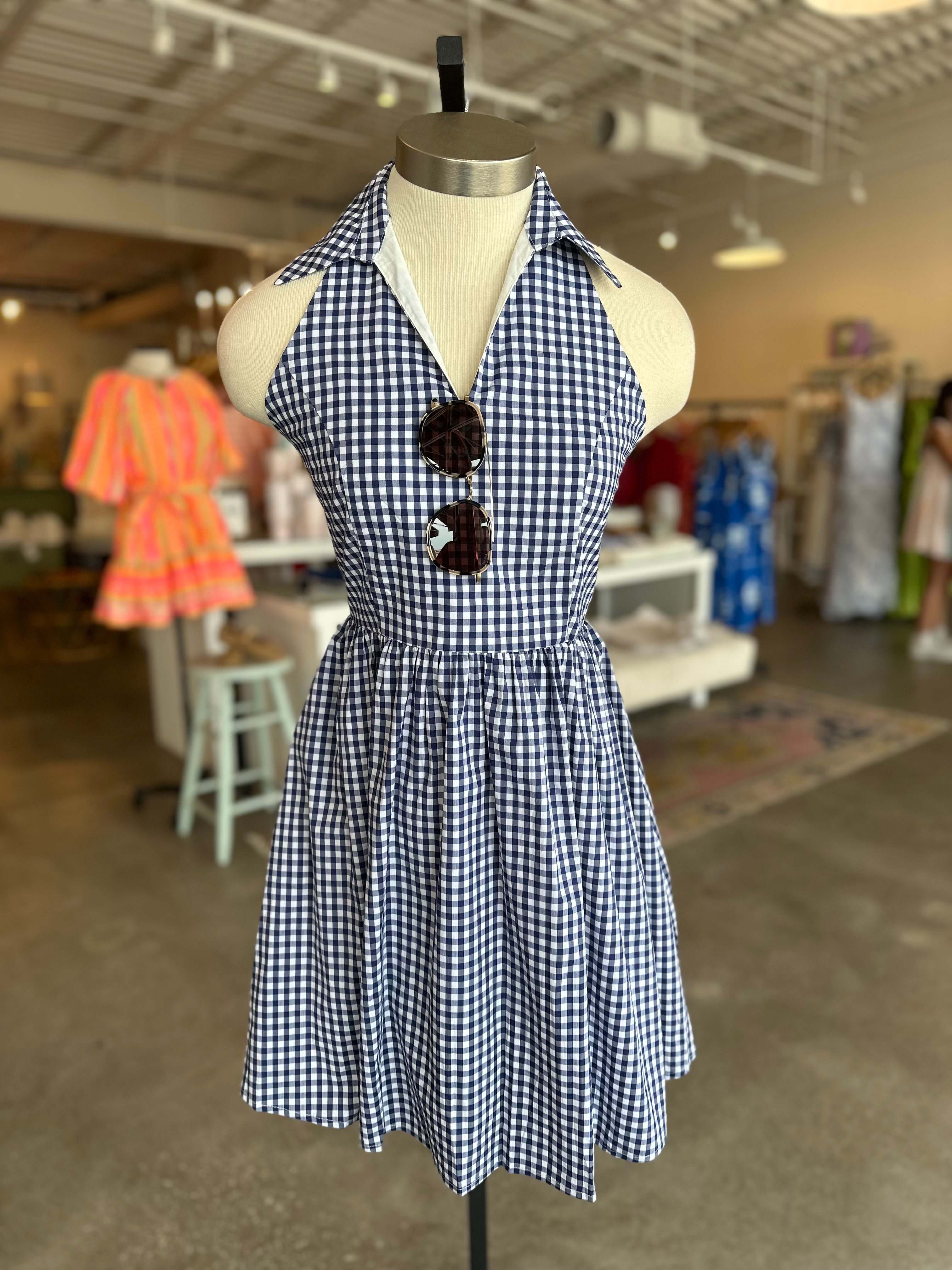 Navy Gingham halter dress features a collared neckline, flirty open back, and gathered waist for a flattering fit.