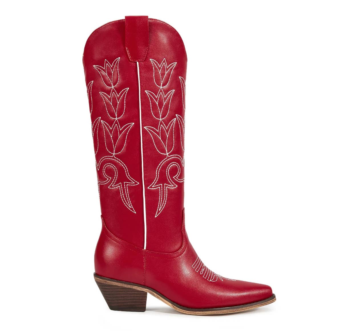 The Reba - our stunning red cowboy boots with intricate white tulip stitching adds a touch of elegance and flair that sets these boots apart. Constructed with comfort in mind, the interior is lined with a soft and breathable fabric, providing a comfortable fit that's perfect for all-day wear. Even better, this style has two pockets on the inside of the right boot: one for lipgloss and one for credit cards, ID, or cash. Material: Vegan Leather