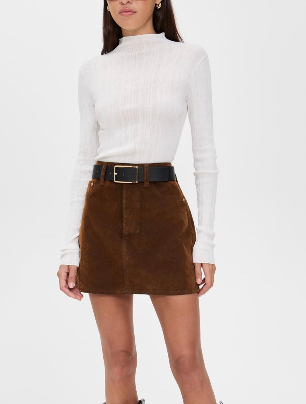 The Stash Skirt in Cognac is a flirty high rise mini skirt in a soft, flocked denim. This skirt's velveteen finish gives it a refined look while maintaining a soft feel.